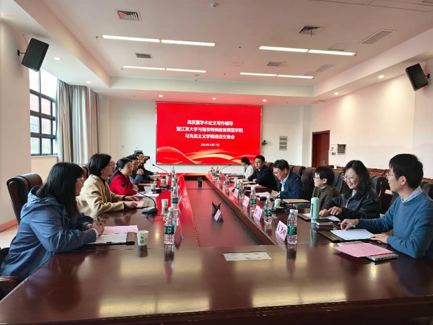 为进一步提高我校教师学术论文写作水平、加强与省内外高水平院校交流合作,4月17日下午,高质量学术论文写作辅导暨江苏大学与南京特殊教育师范学院马克思主义学院建设交流会在我校栖霞校区实验实训楼201会议室举行。江苏大学马克思主义学院院长李丽教授、副院长蒋俊明教授,《江苏大学学报(社会科学版)》副主编、编辑部主任张向凤,《中国近现代史纲要》教研室主任戴迎华教授、《马克思主义基本原理》教研室主任靳媛媛博士、思想政治教育系副主任王红伟副教授参加会议。校长王立新教授出席会议,马克思主义学院党政主要负责同志和学院各教研室主任、青年教师代表参加交流会。会议由马克思主义学院直属党支部负责人主持。