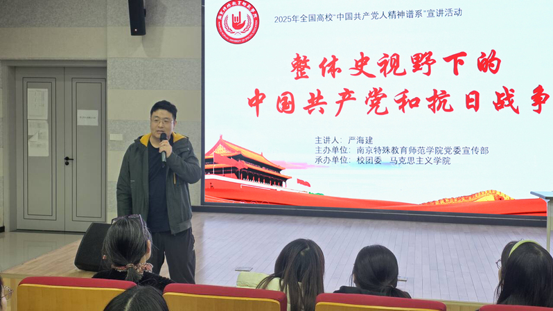 为深入学习中国共产党人精神谱系,传承和弘扬伟大抗战精神,2025年12月6日下午,在我校江宁校区B101会议室举办“中国共产党人精神谱系——抗战精神”主题宣讲活动。本次活动由校团委与马克思主义学院联合承办,特邀南京师范大学历史学系教授、博士生导师严海建,作题为《整体史视野下的中国共产党与抗日战争》的专题讲座,校团委书记李永康出席活动,青马工程江宁校区全体学员、马克思主义学院师生代表到场聆听。