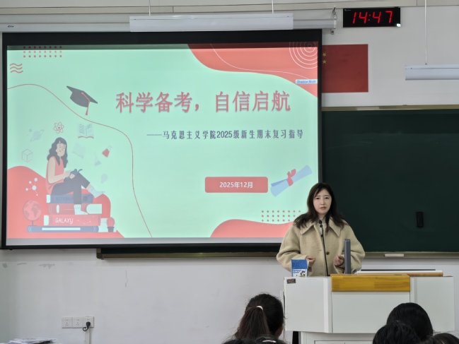 在讲座上,班主任陈文从“时间管理与个性化计划制定”展开指导,帮助学生构建清晰、可行的复习框架。辅导员吴敏随后聚焦“应试心理调适与压力缓解”,分享了多种实用的情绪管理与放松技巧,引导同学们以平和心态迎接挑战。她深情勉励马院首届学子:“作为学院历史的执笔人,当用诚实为墨、担当为纸,为马院书写一个光明而坚定的开篇。”