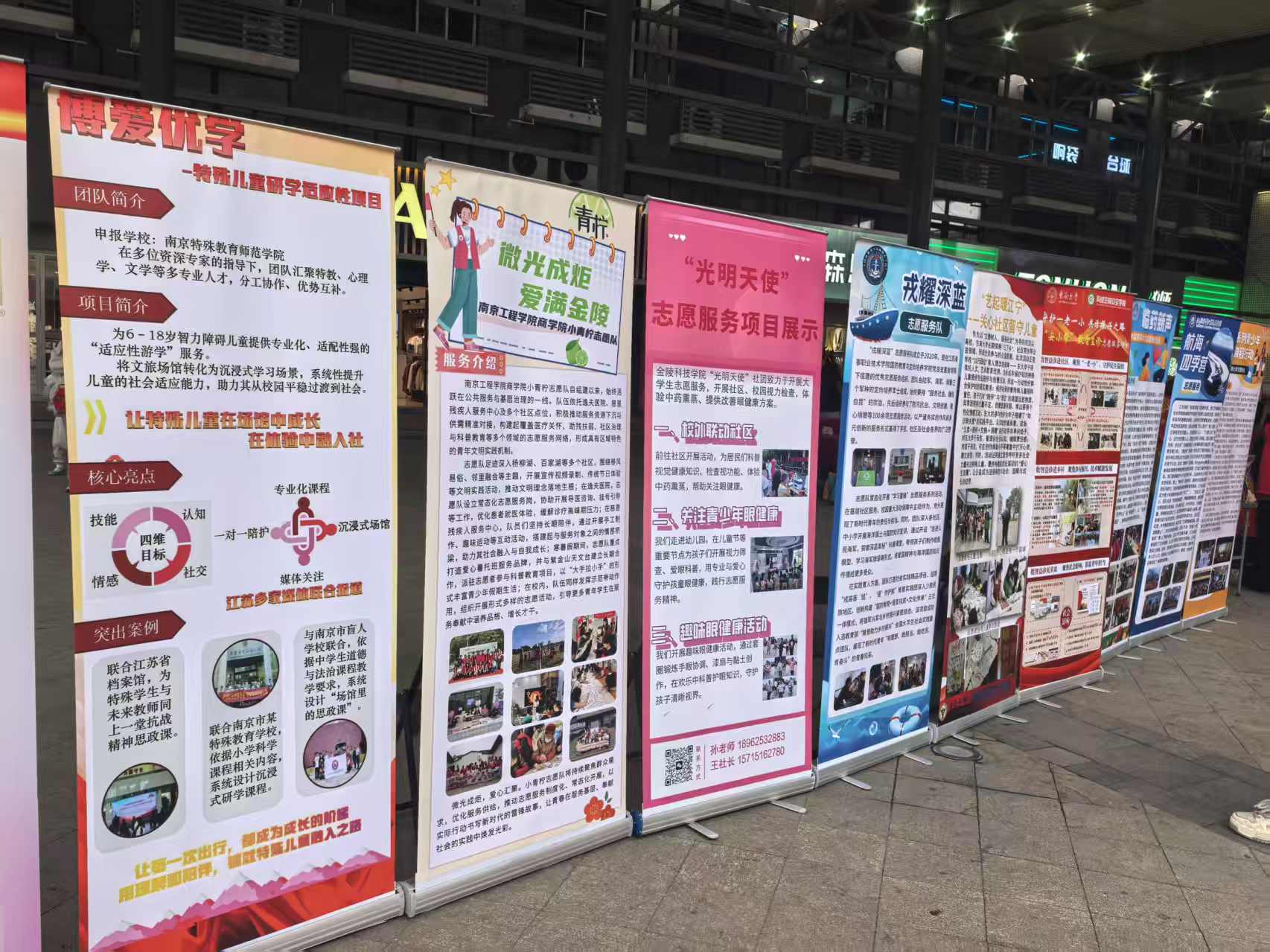 路演现场的项目展板全方位展现了“博爱优学”项目的专业内核与实践成果,突出四大核心亮点:专业化课程(结合特殊教育专业知识设计的适应性课程)、沉浸式场馆(走进红色场馆的体验式学习)、一对一陪护(针对特殊需求的个性化服务)、媒体关注(江苏多家媒体联合报道,社会影响力显著)。项目团队在多位资深专家指导下,汇聚特教、心理学、文学等多专业人才,形成分工协作、优势互补的专业支撑体系。