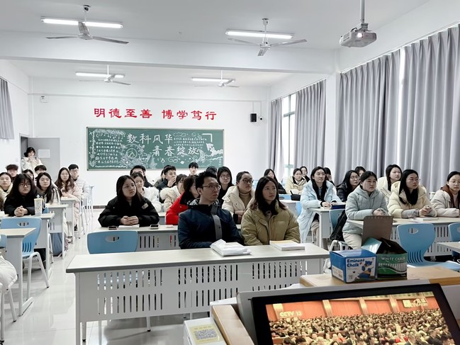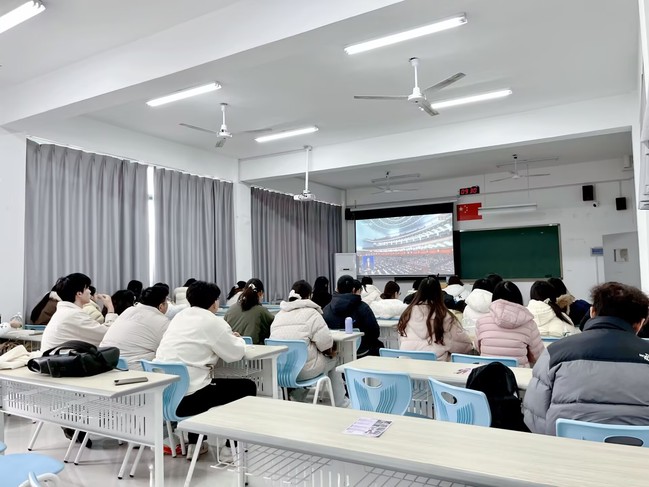 上午9时,师生们通过多媒体设备实时关注两会进程。政府工作报告中关于2026年经济社会发展的目标任务引发广泛共鸣:推动大规模设备更新和人工智能规模化应用,提高城乡居民基础养老金标准,健全社会保障体……一系列政策信号从屏幕中传递至课堂,同学们认真聆听、细致记录,在第一时间接触最前沿的国家发展信息。