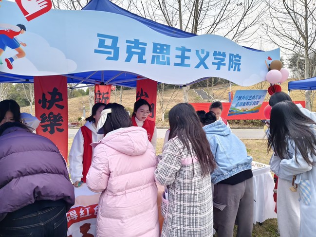 马克思主义学院别出心裁,将理论元素融入趣味互动,让思政教育变得可参与、可触摸。在“初心树”展板前,同学们提笔沉思,写下“成为一名有温度的思想政治教师”、“用理论服务社会”等初心寄语。一片片便签渐渐将光秃秃的树枝点缀得繁茂起来,正如思政教育的种子在春日里悄然发芽。一旁的“金句明信片寄语未来”活动同样人气高涨。印有马克思、恩格斯经典语录的明信片成为抢手货,师生们挑选自己喜欢的金句,在背面写下祝福投入交换箱,再随机抽取一份他人的寄语。不远处的“志愿拼图”区域,三人一组限时挑战,将志愿服务主题图案拼接完整。这种借鉴“盲盒”与“闯关”思路的互动设计,让志愿服务像游戏一样有趣,真正实现了“从旁观者到志愿者”的转变。